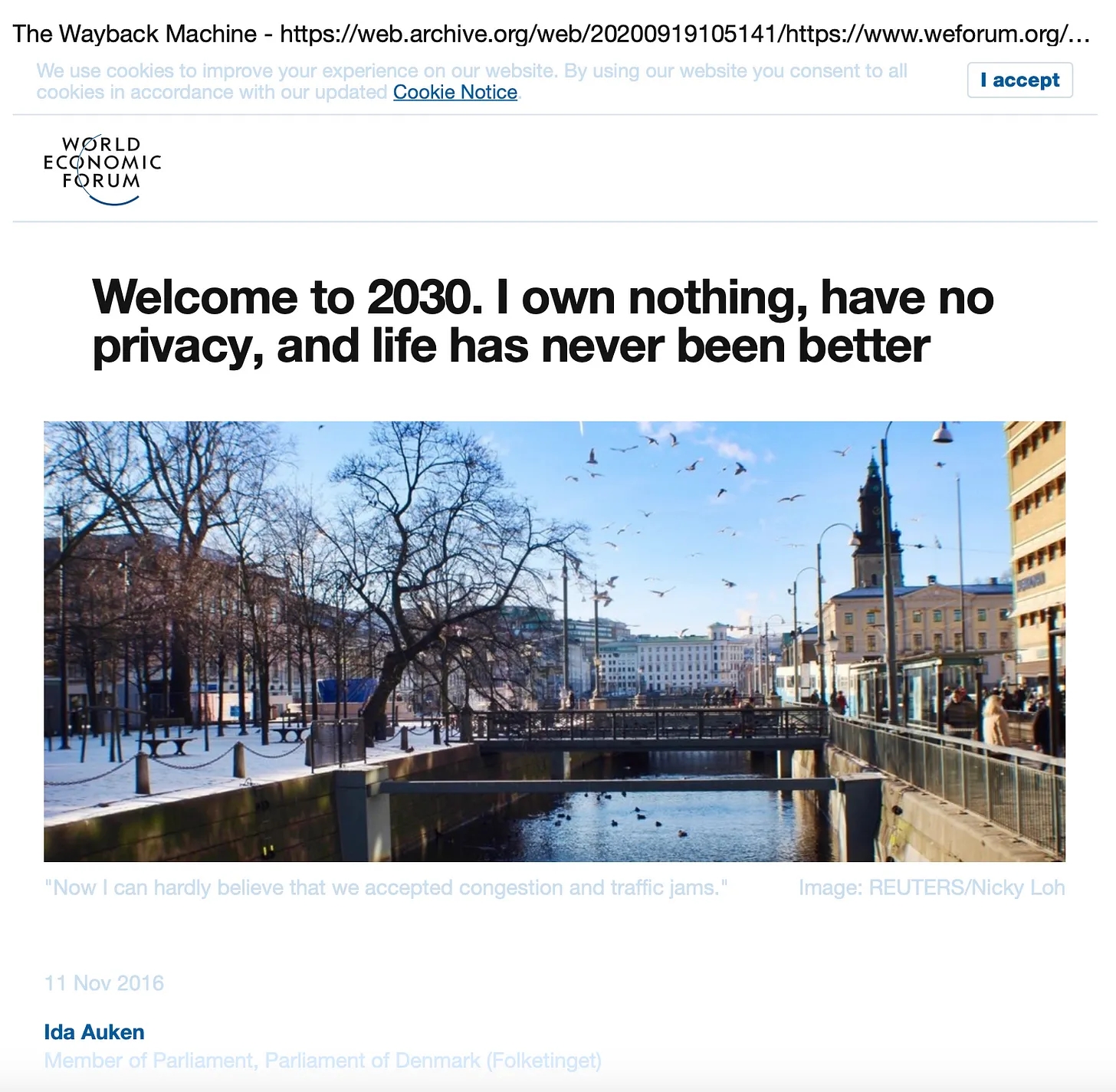 "Willkommen im Jahr 2030", hieß es in dem Artikel eines dänischen Abgeordneten, "ich besitze nichts, habe keine Privatsphäre und das Leben war noch nie besser."
