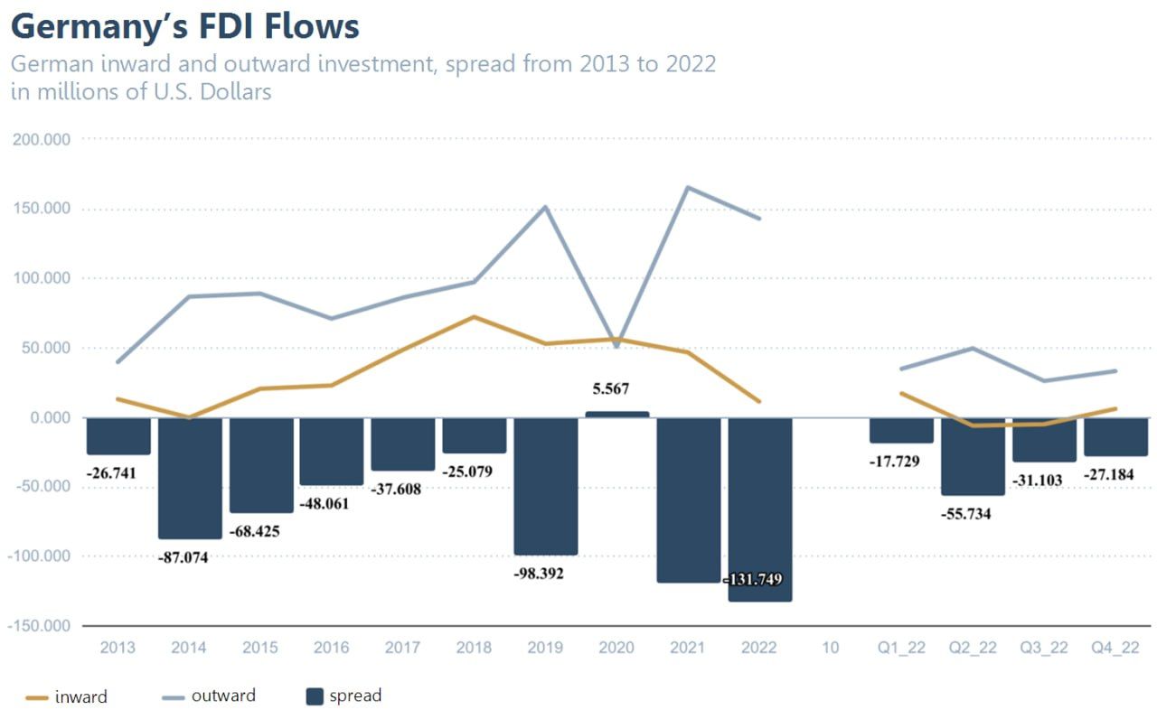 Mehr als 135 Milliarden Euro an ausländischen Direktinvestitionen flossen im letzten Jahr aus Deutschland ab und nur 10,5 Milliarden Euro kamen herein.