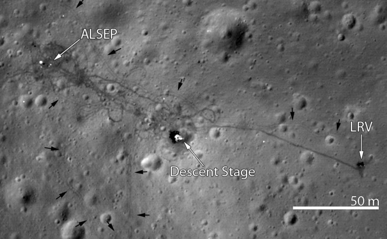 In diesem Bild ist die Landestelle der Apollo 15 Mission zu sehen. Das Mondauto (LRV) ist rechts neben der Landefläche (Descent Stage) geparkt. Links wurde das Apollo Lunar Surface Experiments Package (ALSEP) aufgestellt, ein Gerätekomplex zur Durchführung von wissenschaftlichen Experimenten. Die schwarzen Pfeile markieren die Reifenspuren des Mondautos. (Foto: NASA)
