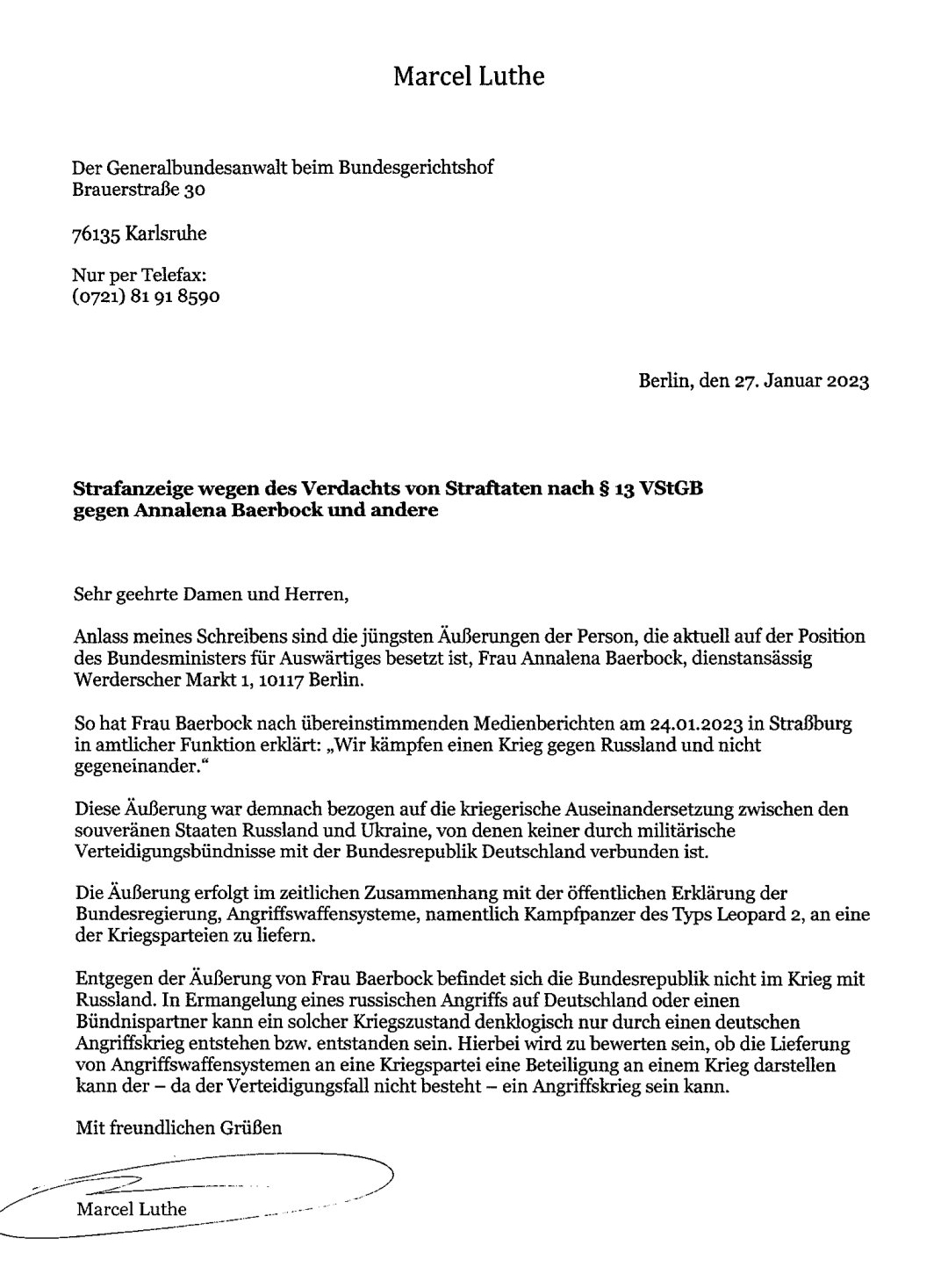 Marcel Luthe stellt Strafanzeige gegen Annalena Baerbock wegen des Verdachts von Straftaten nach § 13 VStGB